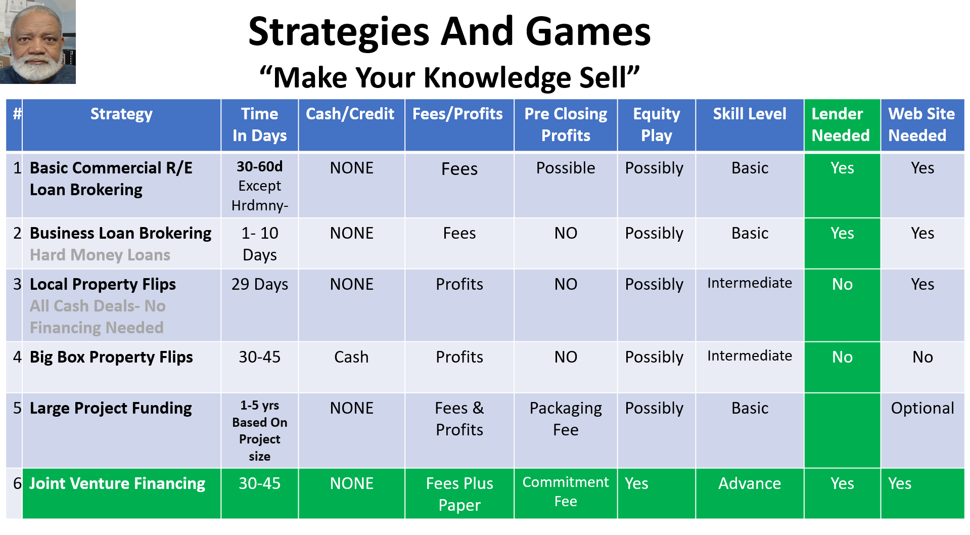 1.Broker a $10 Million Dollar Commercial Project @1% Fee – $100K- 60 Days.